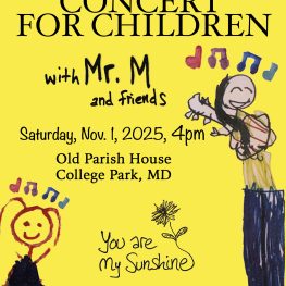 Old Parish House, 4711 Knox Road, College Park MD 20740 View mapCome be a part of this fall’s Sunshine Concert for Children at the Old Parish House in College Park on Saturday, November 1 @ 4pm! Musicians include Eric Maring “Mr. M” and sons Leo & Julian Maring along with other remarkable young players. Bring your voices and families and be a part of this always memorable, heart-warming community event.